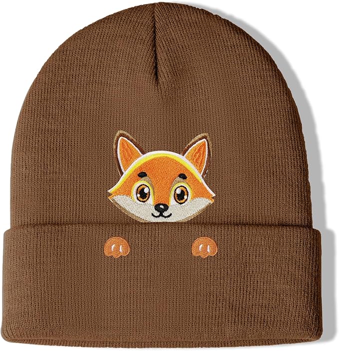 This brown cuffed knit beanie features an embroidered fox peeking over the front fold. Made from a soft, ribbed knit for everyday comfort, the warm color and bright fox detailing add character while keeping the look simple and wearable. One-size-fits-most and easy to style, it’s a cozy staple with a playful edge.